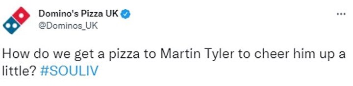 Pizza company Domino's even took to Twitter to mock Tyler's reaction to Liverpool's goals by saying: 'How do we get a pizza to Martin Tyler to cheer him up a little?'.