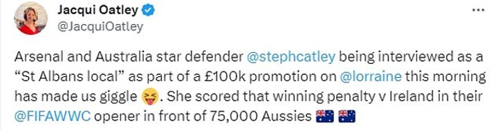 The bizarre incident left fans in stitches, with broadcaster Jacqui Oatley tweeting: 'Arsenal and Australia star defender being interviewed as a "St Albans local" as part of a £100k promotion on Lorraine this morning has made us giggle.