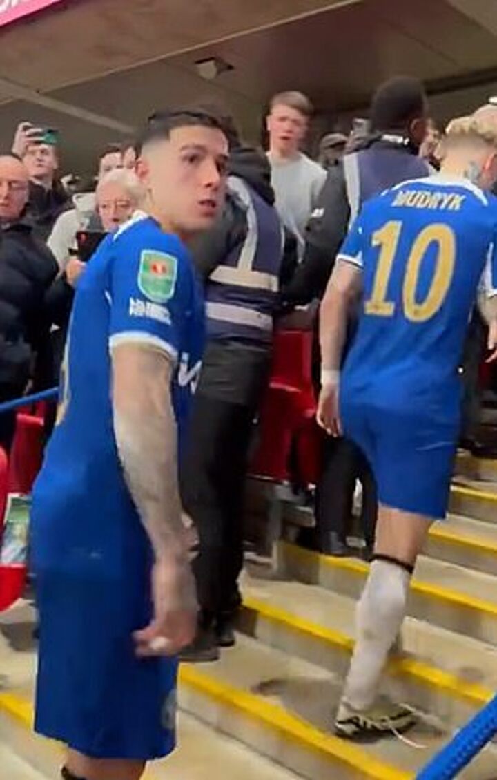 Enzo Fernandez had to be led away after being mocked by a Liverpool fan following Chelsea's defeat in the Carabao Cup final.