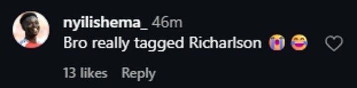 One user, aspiringfitfam, replied: 'Over to you, Richarlison' with three laughing emojis and another, nyilkishema_ wrote 'Bro really tagged Richarlison.'