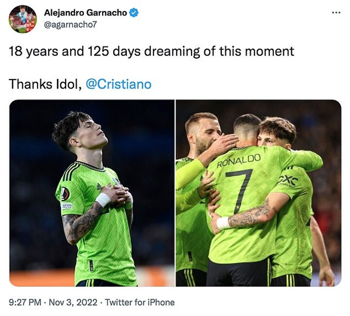 Garnacho tweeted: '18 years and 125 days dreaming of this moment. Thanks Idol, @Cristiano'