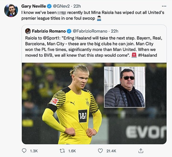'I know we've been c*** recently, but Mino Raiola has wiped out all of United's Premier League titles in one foul [sic] swoop,' the former United captain said.