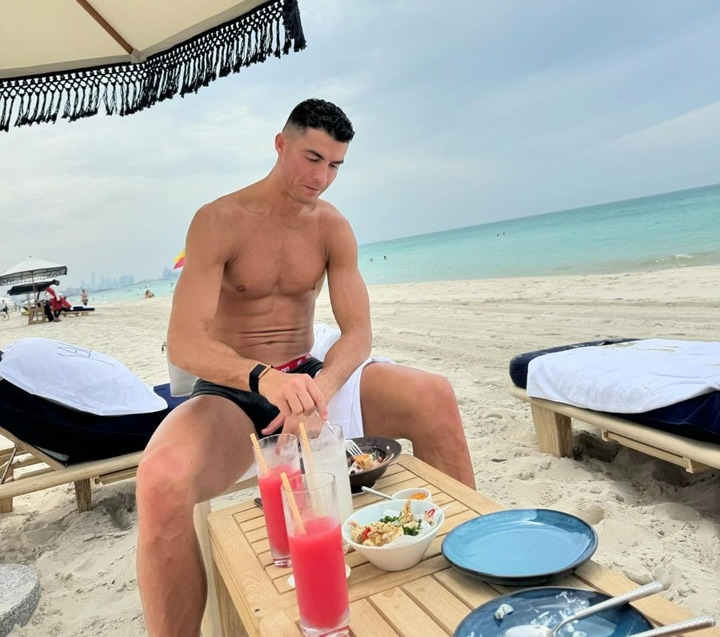 Meanwhile, Georgina also added a topless snap of Ronaldo enjoying some food on the beach.