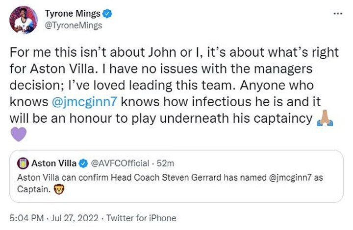 Gerrard handed the armband to midfielder John McGinn and sent Mings, who had succeeded Jack Grealish as skipper a year ago, back to the ranks.