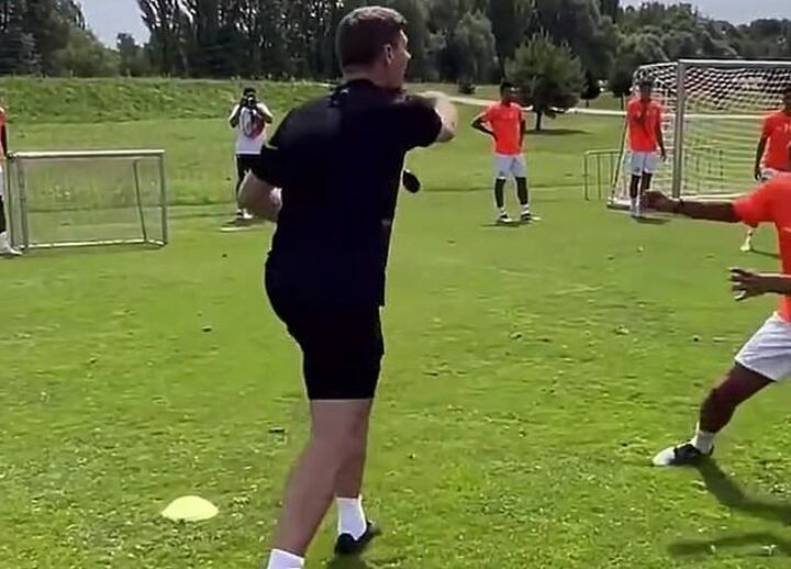 The 43-year-old is fully invested in the training session as he starts to ramp up preparations ahead of the new season that gets underway in August and is seen encouraging his players during the short video.
