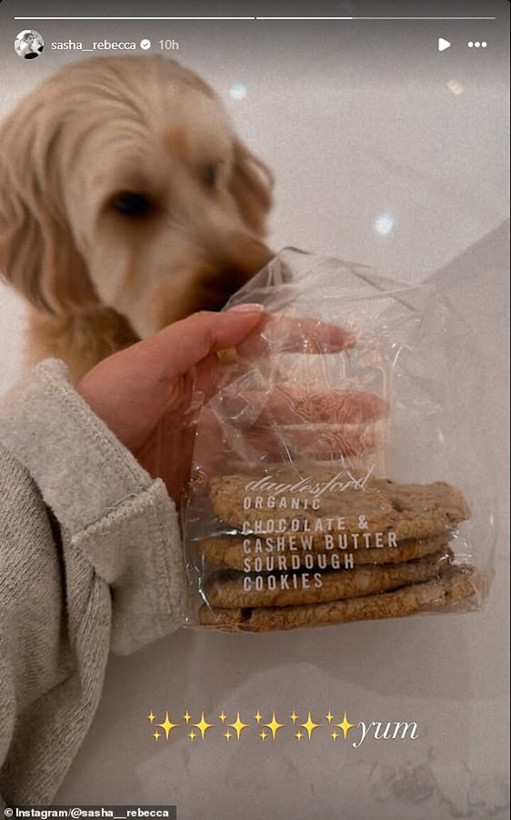 She appeared to be enjoying a night in on Sunday, taking to Instagram to post a image of 'organic sourdough' cookies alongside one of the couple's dogs.