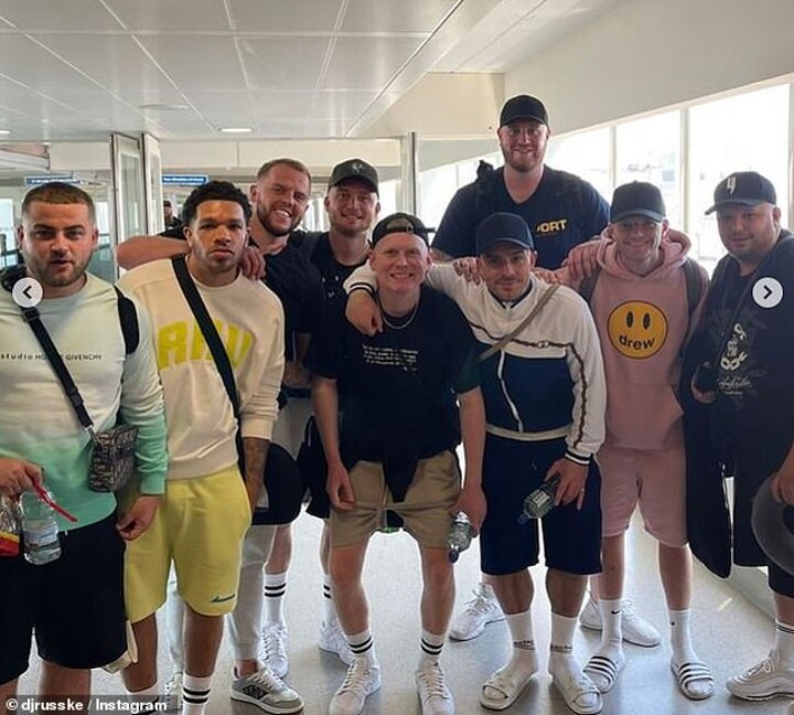 Looking bleary eyed, the England international made his way onto an escalator with his entourage before leaving on a private bus.