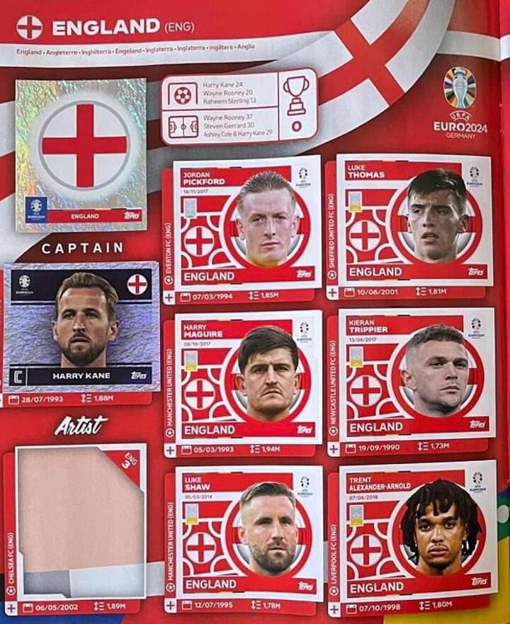 Because of the FA tie-up with Panini, the Topps album only carries 'floating heads' of England stars. And because Topps don't have the rights to some individual players, they are filling the gaps with 'England' players like Leicester City defender Luke Thomas and Manchester City's Rico Lewis.