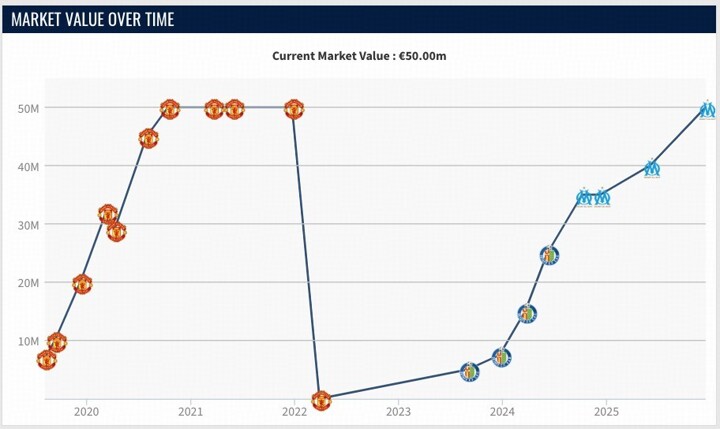 Greenwood left Manchester United, was loaned to Getafe in September 2023, and joined Marseille a year later with a transfer fee of €26m. Thanks to his outstanding performance, Greenwood's market value rose to €25m during his time at Getafe, and has now doubled at Marseille.
