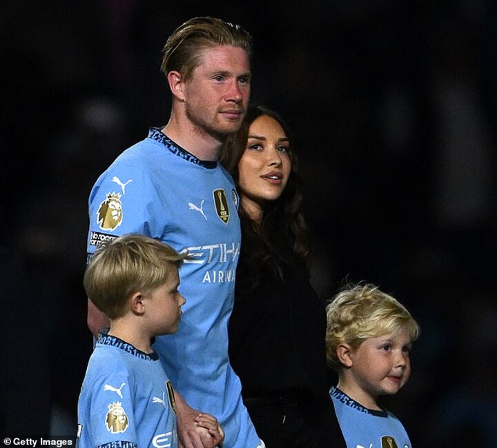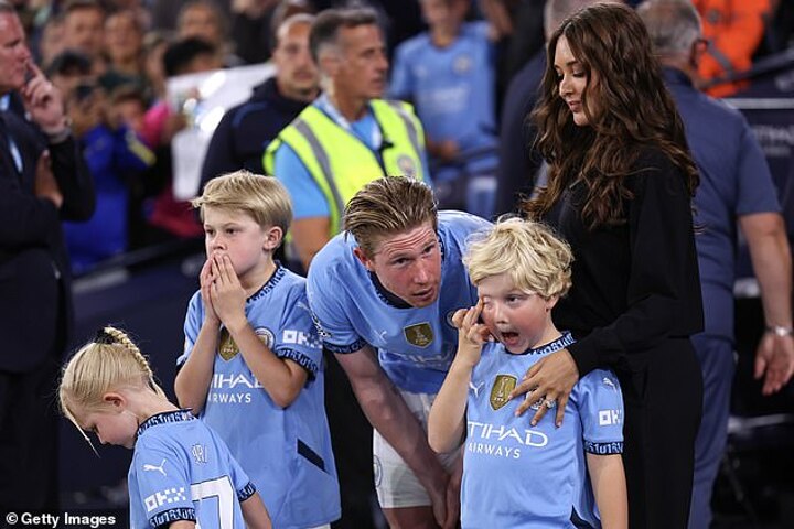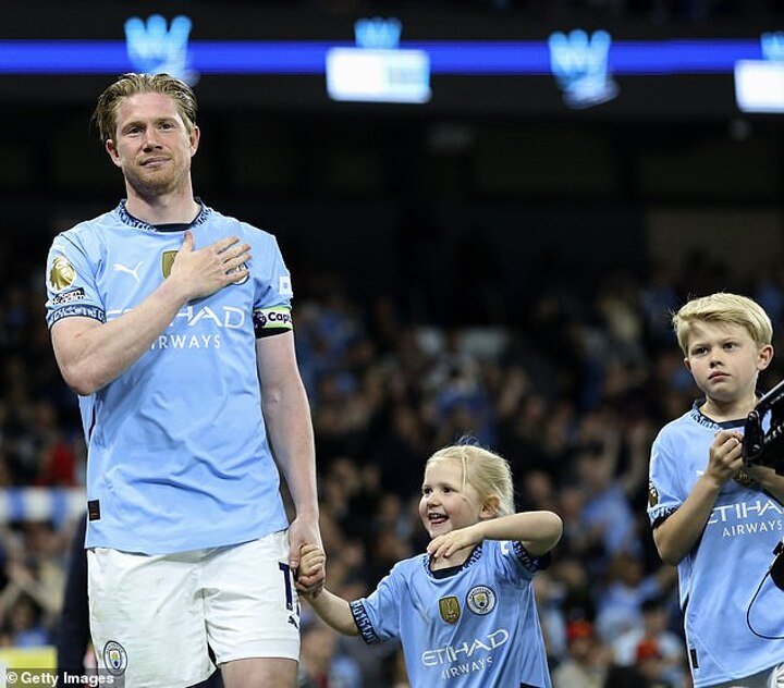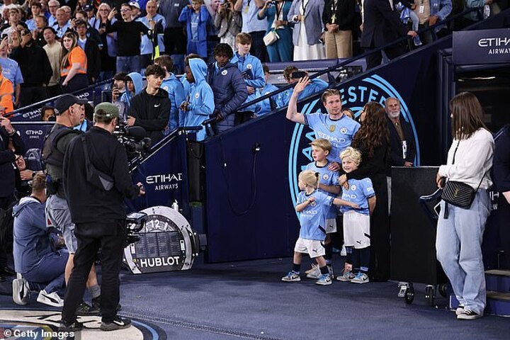 As the lights went out inside the ground, De Bruyne, alongside his wife Michele and their three children - Mason, Rome and Suri - took to the pitch for the final time as the fans sang his name.