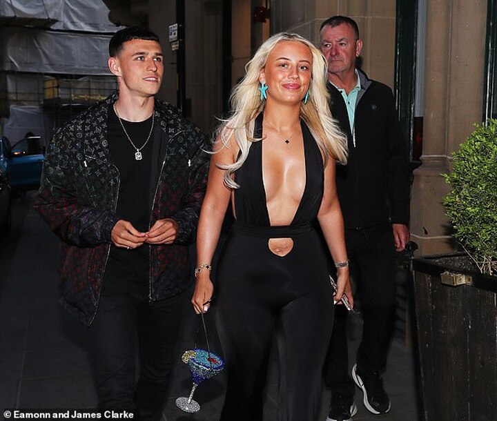 Phil Foden turned up in a dark outfit with a designer jacket and chain alongside his long-term girlfriend Rebecca Cooke, with whom he shared three children.