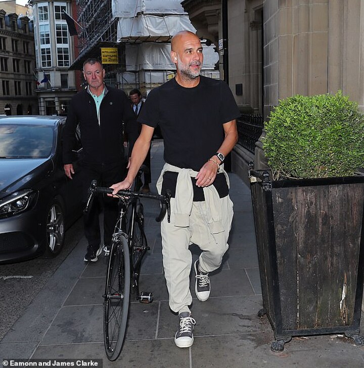 The whole crew turned out, including Guardiola, who arrived with his earbuds in as he steered his bike towards its parking spot.