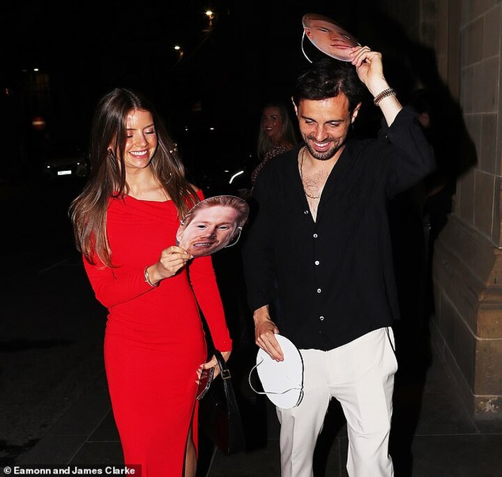Bernardo Silva and his wife Ines made merry with Kevin De Bruyne masks as they left the venue in central Manchester.