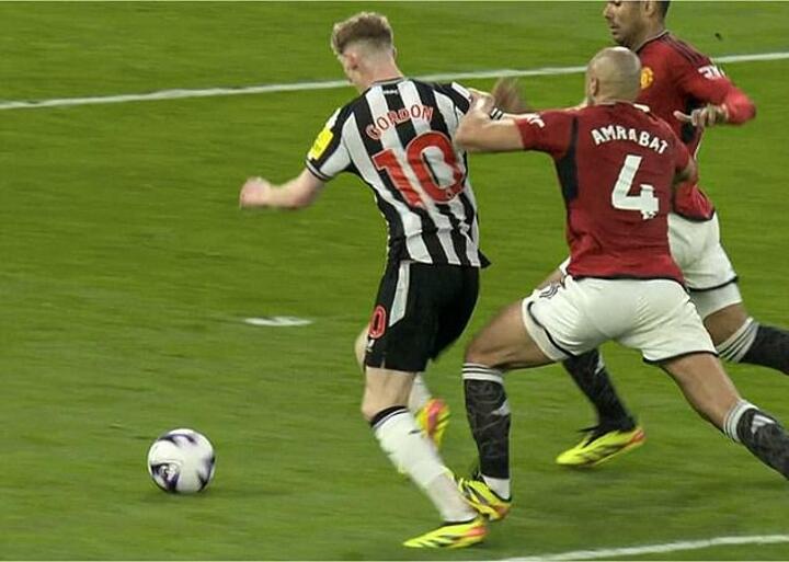 Anthony Gordon's sock was left torn after Sofyan Amrabat’s first-half challenge in the penalty area, but there was no VAR check at Old Trafford.