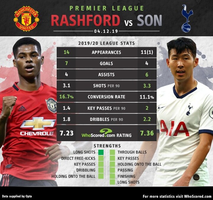 Check out Head to Head stats between Rashford and Son Heung-Min. Who will score today in their clash at Old Trafford? Copyright Declaration