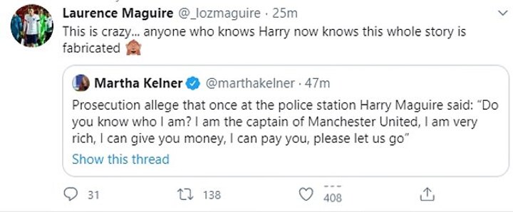 Maguire's brother Laurence tweeted: 'This is crazy... anyone who knows Harry now knows this whole story is fabricated.'