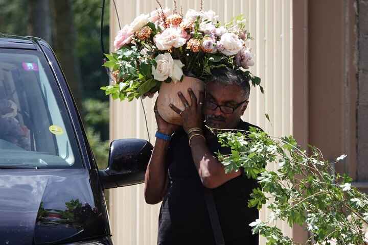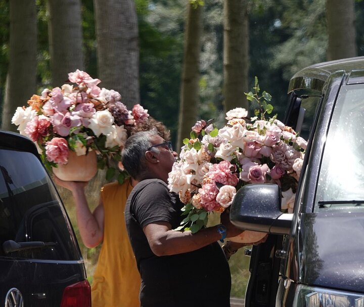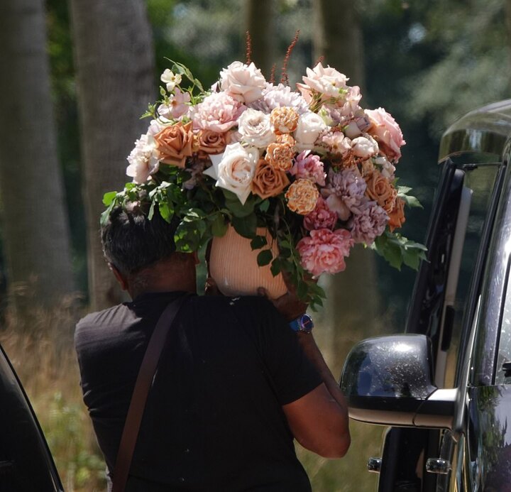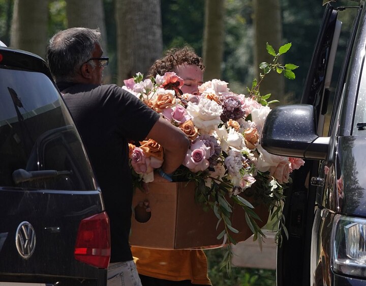 Heaps of beautiful flowers arrived at the couple's wedding venue on Saturday ahead of them getting married in front of close friends and family.