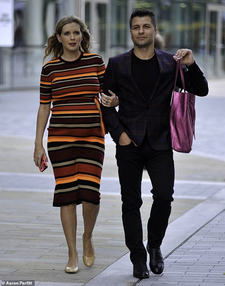 Pregnant Rachel Riley was arm in arm with husband Pasha Kovalev on Wednesday as they arrived at Manchester United stadium Old Trafford.