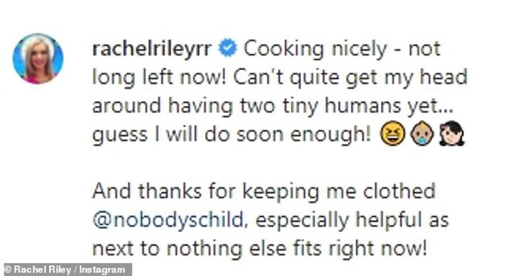 She captioned the snap, which saw 20-month-old Maven playing alongside the pair: 'Cooking nicely - not long left now! Can’t quite get my head around having two tiny humans yet… guess I will do soon enough!'