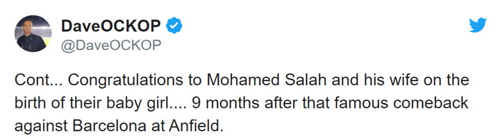 And, in what could be one just massive coincidence, Mohamed Salah's wife has reportedly given birth to a baby girl today, which they have named Kayan.