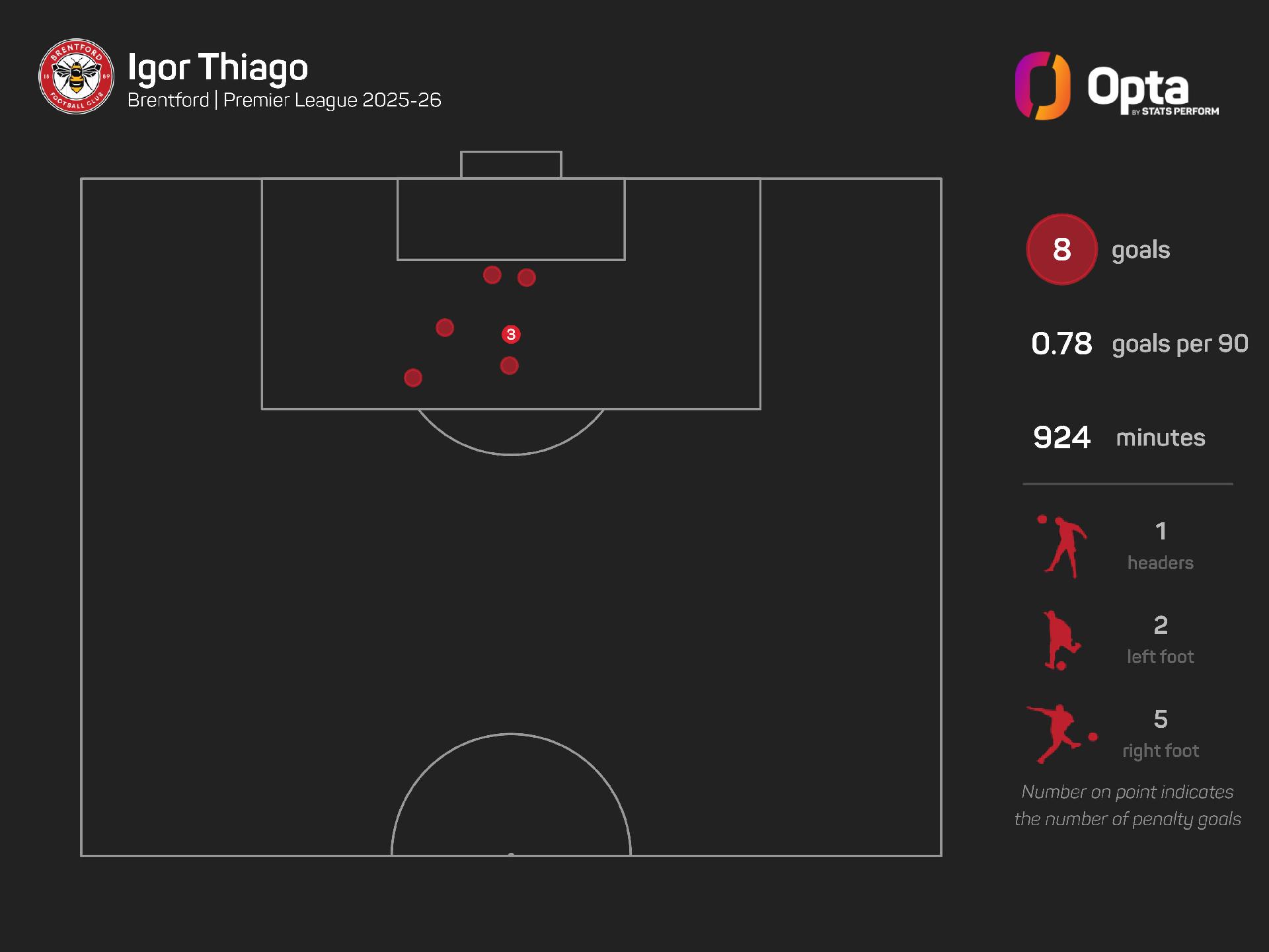 His eight goals are the joint-most by a player in Brentford's first 11 games of a Premier League campaign, along with Ivan Toney in 2022-23 and Bryan Mbeumo in 2024-25.