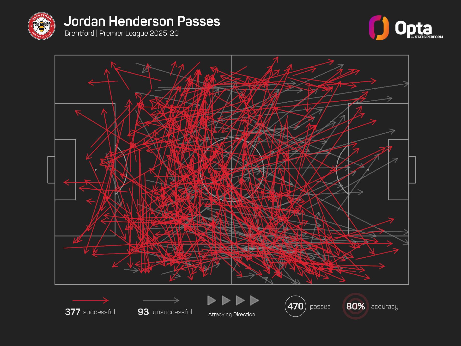 Henderson has made 11 Premier League appearances, providing two assists as well as completing 377 passes, a total only bettered by Sepp van den Berg (402) and Nathan Collins (404) for Brentford in the top-flight in 2025-26.