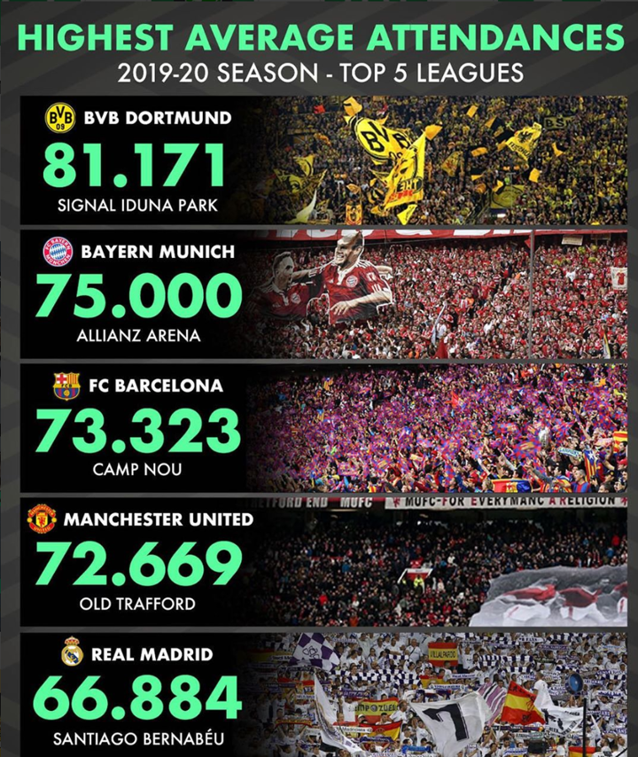 Dortmund's home stadium Signal Iduna Park has the highest average attendances this season as there are on average 81,171 people who go to the stadium to watch every Dortmund's game.