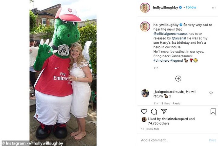 Willoughby wrote on Instagram: ' Very very sad to hear the news that @officialgunnersaurus has been released by @arsenal. He was at my son Harry's 1st birthday and he's a hero in our house!