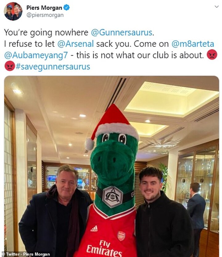 Good Morning Britain presenter Morgan also tweeted on Monday, saying 'You're going nowhere @Gunnersaurus. I refuse to let @Arsenal sack you. Come on @m8arteta @Aubameyang7 - this is not what our club is about. #savegunnersaurus,' he tweeted along with a series of angry emojis.