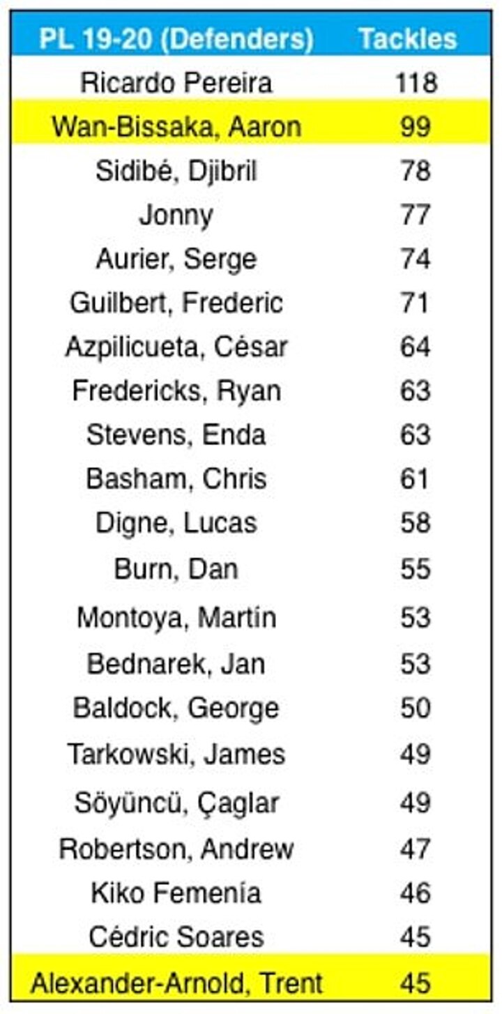 The 22-year-old has managed 99 tackles in the Premier League this season, putting him second for defenders behind just Ricardo Pereira. Meanwhile, Alexander-Arnold has attempted just 45 tackles.