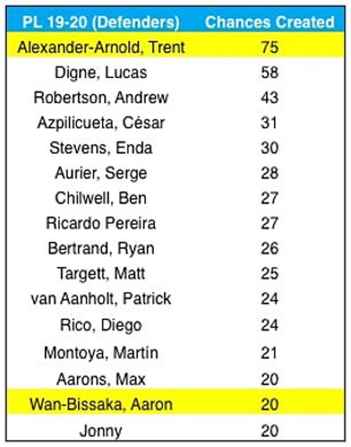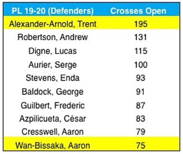 Admittedly, only 40 of Alexander-Arnold's are from open play – he is also a set-piece specialist – but that's still a huge gap.