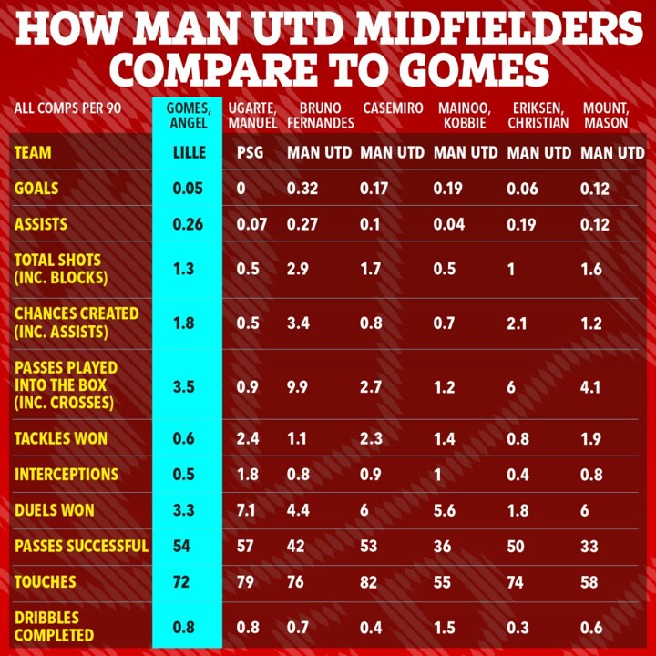 Gomes was also better than all United stars for successful passes, with only ball-winning specialist Ugarte having more per 90 during his time at Paris Saint-Germain.