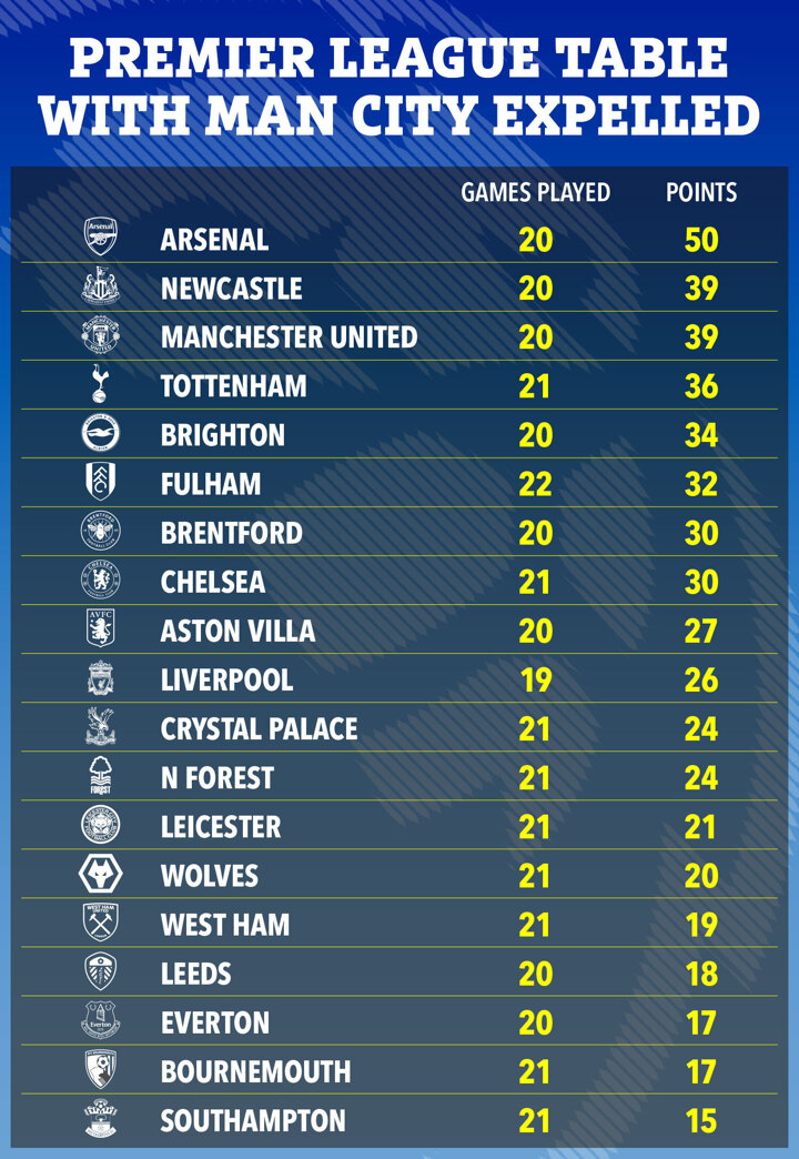 And a Prem table if City were expelled today, with all of their results wiped, leaves Arsenal ELEVEN points clear at the top.