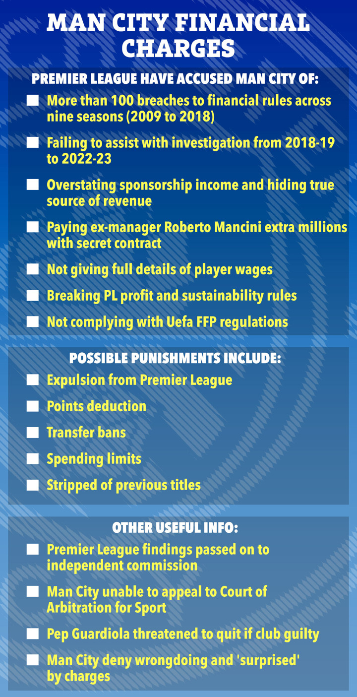 A number of punishments for City are possible - from a slap on the wrist and a fine to enforced relegation or even expulsion from the Prem.