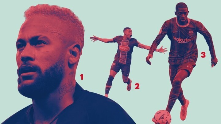 After selling Neymar (1) in 2017, Barça reportedly turns down Kylian Mbappé (2) and signs Ousmane Dembélé (3) instead © Mehdi Taamallah; John Berry; Pedro Salado via Getty Images