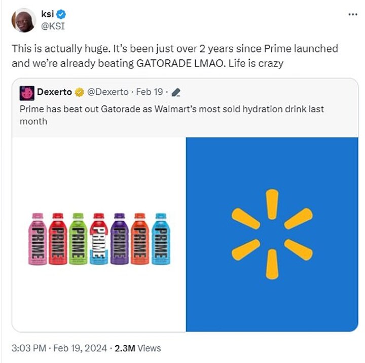 KSI in response to a tweet about the news, wrote: 'This is actually huge. It’s been just over 2 years since Prime launched and we’re already beating GATORADE LMAO. Life is crazy.'