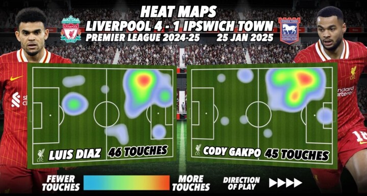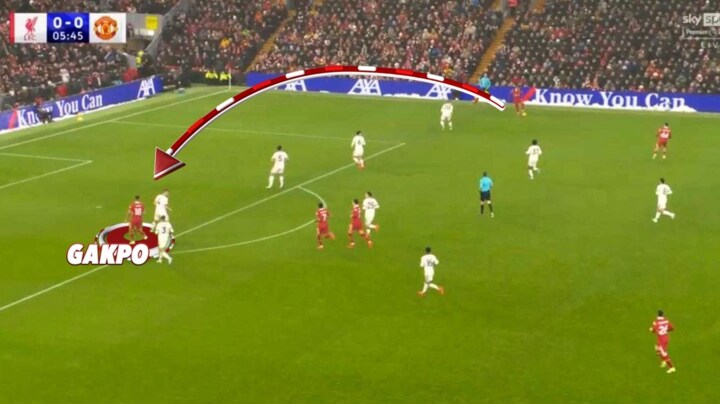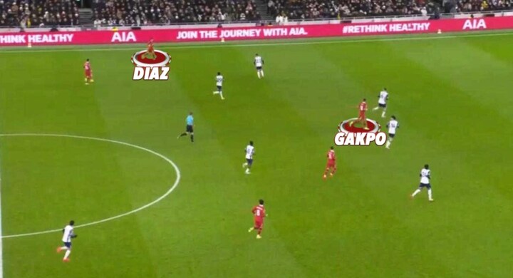 When a long ball is needed, Gakpo will often drift into the left inside channel, where he can win more in the air while Diaz drifts out to the left flank.