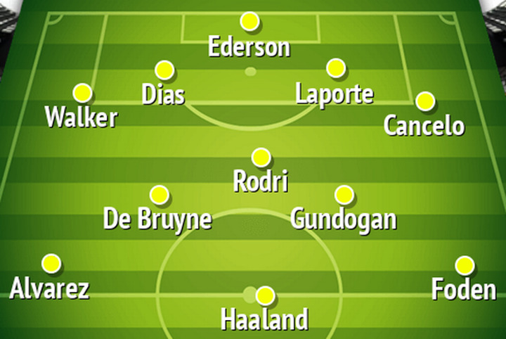 Possible City lineup without Sterling, Bernardo and Jesus: Ederson; Walker, Dias, Laporte, Cancelo; Rodri, De Bruyne, Gundogan; Alvarez, Haaland, Foden.