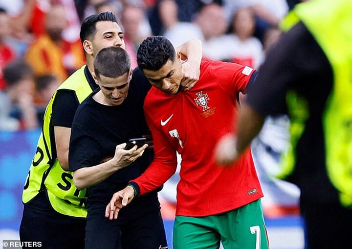 Cristiano Ronaldo was approached by six pitch invaders during the game with Georgia, and was narrowly avoided being kicked by a fan who leapt at him from the stands after the game.