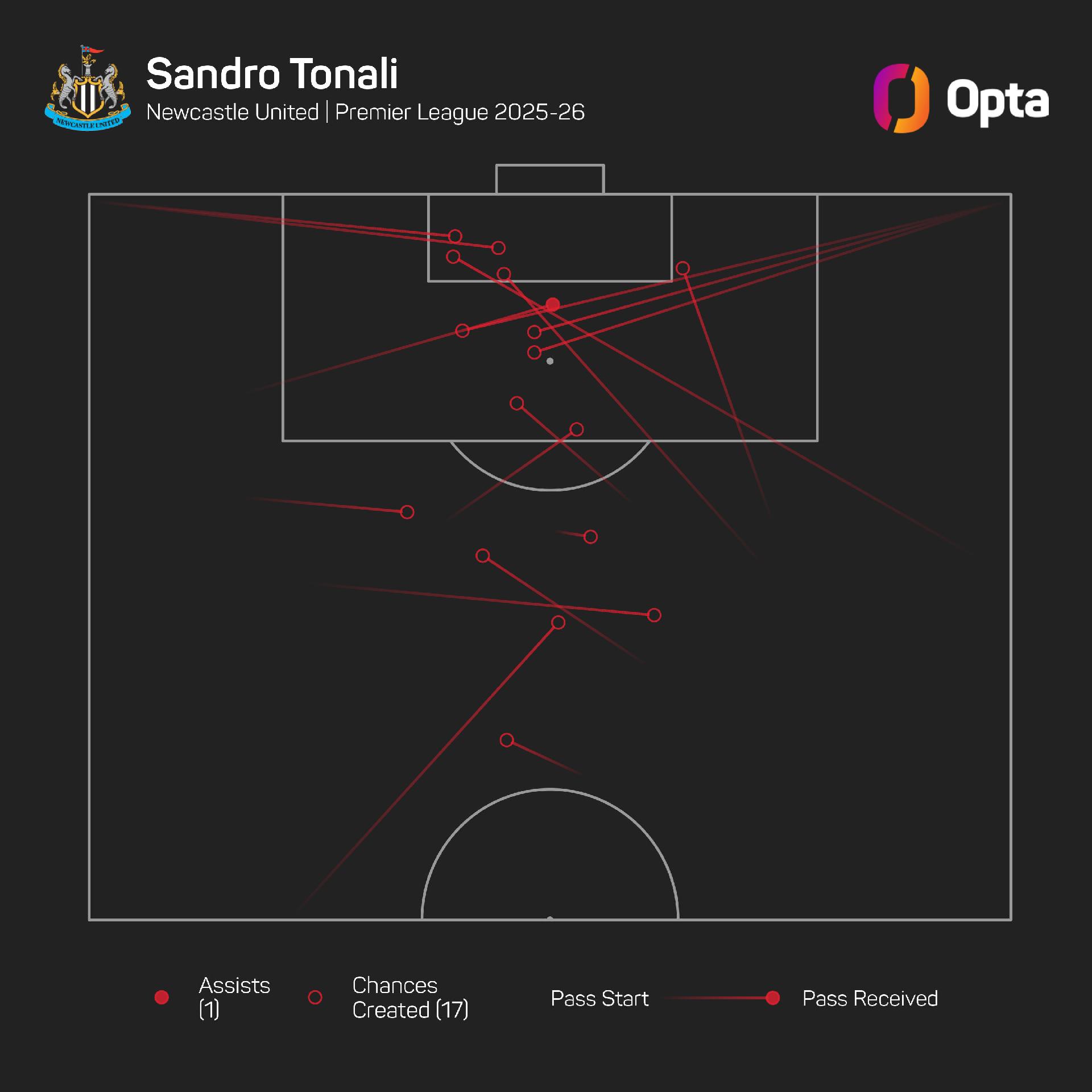 Tonali has made 35 appearances for Newcastle this term, though he is yet to score. He has, however, assisted four goals and created 34 chances, which ranks behind only Bruno Guimaraes (49) in the Magpies' squad. The 25-year-old has also won 32 of his 45 tackles.