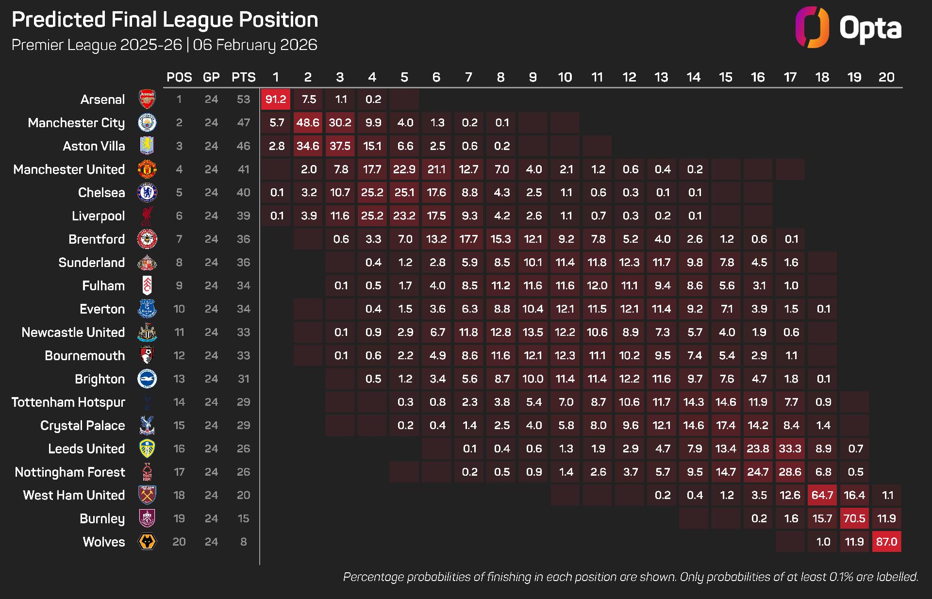 The Magpies have lost their last two Premier League matches, last losing more on the spin in December and January in 2023-24 (four). The Opta supercomputer now assigns them just a 1% chance of a top-four finish, with ninth (13.5%) seen as their most likely position.