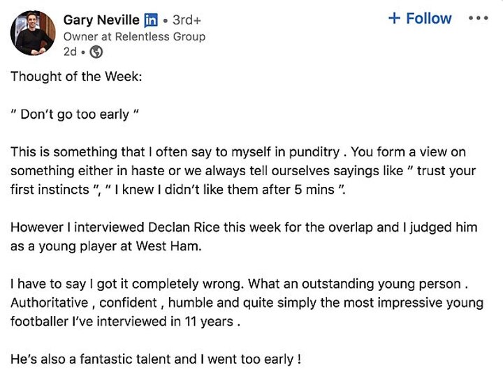 Gary Neville has taken to social media to admit that he was 'completely wrong' about West Ham United midfielder Declan Rice.