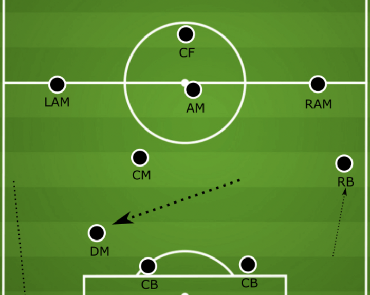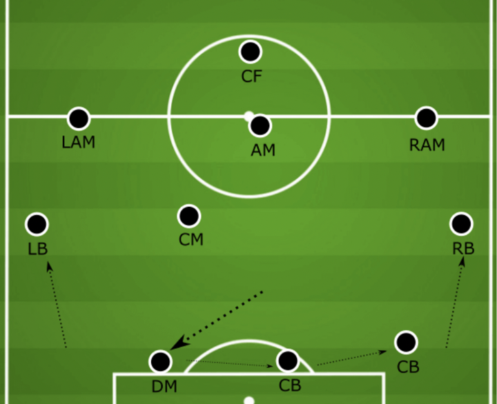 There is always the option for the opponent to press high in the pitch. On that occasion, and if the opponent is pressing with two strikers, an option would be the defensive midfielder to drop either among or next to the two centre-backs. On that way, the team with the 4-2-3-1 formation gets over with the numerical disadvantage and has more chances to transfer the ball from the back. The rest of the players have a similar position as before and try to stretch the opponent’s formation and exploit any possible gaps and weaknesses.