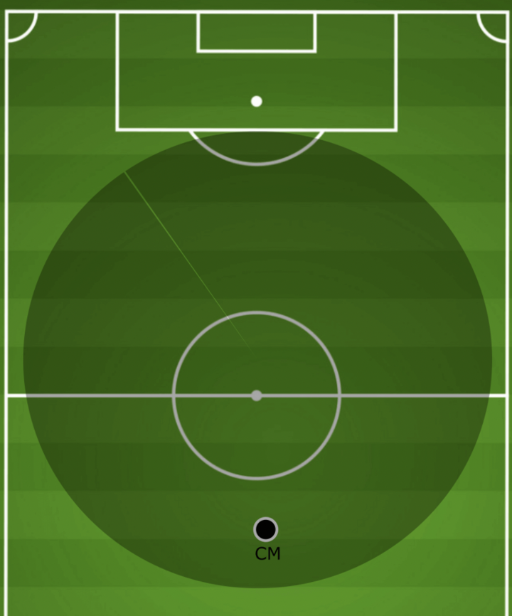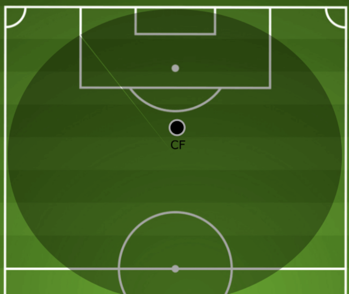 Because of the formation, the centre forward has to be physically strong, and able to receive the ball under instant pressure. That is because he is the only striker, and for that reason, he has to face two or three defenders. The striker must be quick with electric pace, and able to read the game to exploit free spaces or take better positioning from the defenders. He must have the ability to score from different distances and in different ways. Moreover, he must be able to play away from the box. On that way, he will support the possessional play and will create spaces that the attacking midfielders can take advantage of. Specifically, the centre forward and the central attacking midfielder have to cooperate and have excellent communication on the field, as they can exploit opposition in many different ways, and especially by creating free spaces with their movements. Despite that, the centre forward is the first defender of the team. For that reason, he must have the physical condition to press high and try to regain the ball. Below is an image that is indicating the area that a centre forward is moving within the 4-2-3-1 formation.
