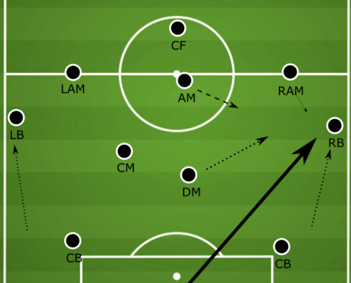 Another option for the goalkeeper if the opposition adjusts in this scenario could be a long ball into the wide areas. Teams that pressure high usually do it with three or four players. So, if the goalkeeper tries a long ball into the wide areas, to one of the two full-backs, then automatically passes over the opposition’s high defensive block. The issue then is that the players around the full-back have to support him immediately to retain the possession of the ball and start the possession game from the middle third of the field.