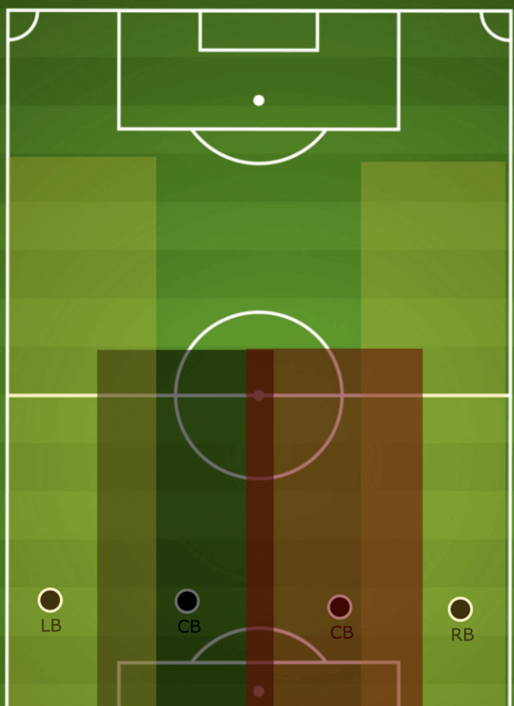 The full-backs are two of the fittest players in the field. Full-backs should be fit, as depending on the manager’s game model, they should participate within the offensive part of the game by over or under-lapping the wide attacking midfielders, and they have to be able to deliver the ball into the box. Additionally, full-backs must be good defenders, as most of the time, they have to deal with the most technical players of the opposition, like wingers, or wide attacking midfielders. Full-back’s spaces are the wide areas, and they could go inside to support the team either when in possession, or when the team is defending. The two centre-backs must be able to defend in a 1-vs-1 situation and understand both zonal and man-to-man marking. They have to communicate with each other and be able to organise the team from the back. Depending on the manager’s game model, centre-backs should be good with the ball on their feet, as they are starting the possessional game of the team. The image below demonstrates the areas that the players are moving during a game.