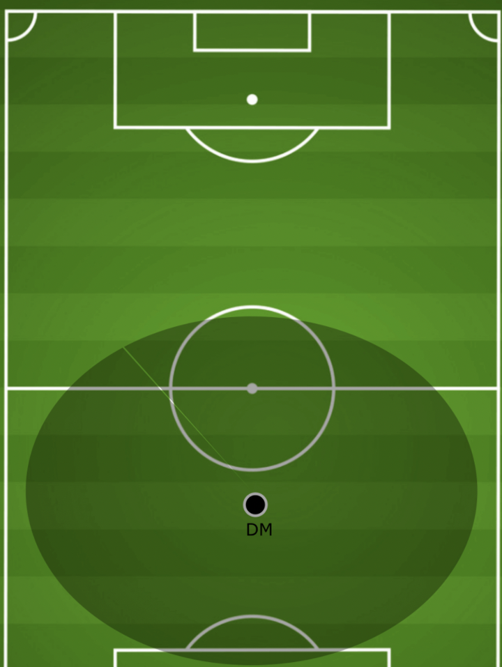 Going higher in the pitch, and analysing the two midfielders, someone can notice that this formation divides the responsibilities among them. There is a defensive midfielder, that is moving in front of the defensive line and is trying to hold the balance. For that reason, that player is mostly a strong physical player that can deal with ground and aerial duels. Moreover, this player, many times, acts as a linking player between the defensive and the offensive line, as he receives the first pass from the back. There are times that the defensive midfielder will go higher in the field to cover the central midfielder. The central midfielder is a more technically gifted player. He has to be strong, physically fit, quick, and with a high level of endurance, as he supports the team with and without the ball all over the field. He must be a player that can penetrate the opposition, and break lines with his passes, as his team has more chances to win the game if he manages to pass the ball well from midfield. The image below is showing the areas that the two midfielders are covering, depending on their role during a match.