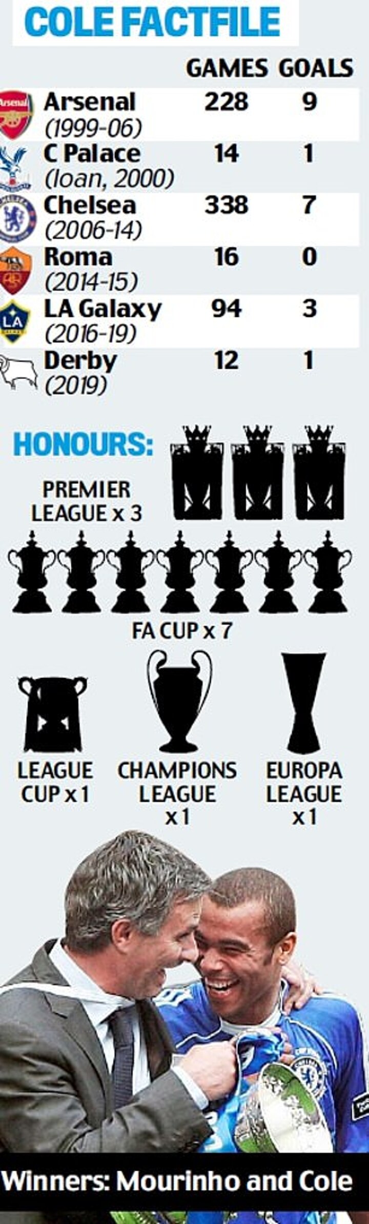 COLE: First Chelsea meeting, Jose has every player’s name written down and their details: height, whether they’re left or right footed... everything. Every player I’m up against, we’d go through video analysis. With Wenger, it was about trusting the players and learning by your own mistakes. With Jose, you can’t make mistakes or you won’t play. If you didn’t do your job, then the ruthlessness of Jose was: ‘Bye bye.’