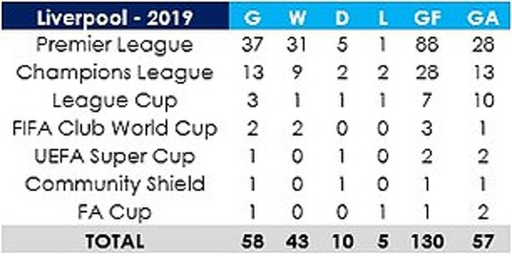 In total, the Reds won 43 of their 58 games across all competitions in 2019, drawing ten and losing just five.