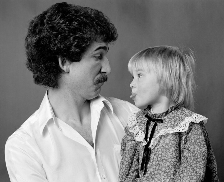A black and white photo from 1979 shows four-year-old Kelly poking out her tongue at the hardman midfielder with the Tom Selleck ’tache and bushy hair.